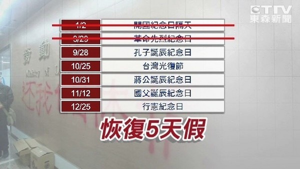 1月2日1月1日開國紀念日的隔天有放假嗎?、3月29日革命先烈紀念日有放假嗎?、9月28日孔子誕辰紀念日教師節有放假嗎?、10月25日台灣光復節有放假嗎?、10月31日先總統蔣公誕辰紀念日有放假嗎?、11月12日國父誕辰紀念日有放假嗎?及12月25日行憲紀念日有放假嗎? 從今天開始通通恢復放假囉!!!!