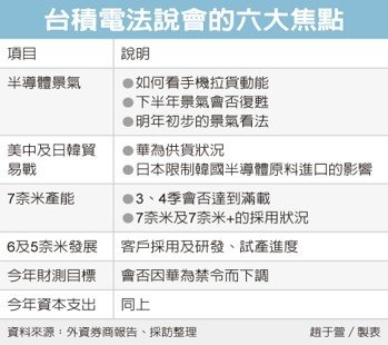 外資圈預期,台積電第3季營收將創下同期新高,不過近期來自貿易戰的變數增加,外資分析師期許本周四(18)日法說會說分明,包括對於半導體景氣、美中及日韓貿易戰、7奈米產能、更先進的6/5奈米發展、今年財測以及資本支出等六大焦點,將受到市場關注。