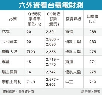 其他外資券商對台積電本季營收看法也偏樂觀,滙豐證券預估季增率達15%,瑞信估季增14%,較保守的摩根士丹利,雖預估僅季增7%至8%,但整體外資估算的營收目標落在2,720億元至2,892億元,仍將是台積電歷來最佳的第3季。